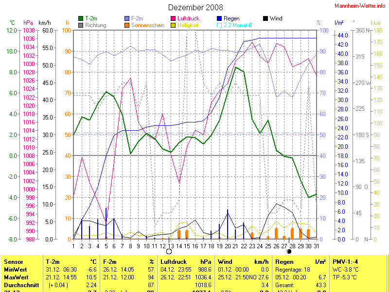 Der wärmste Tag war der 21.12.2008 um 14:55 mit 10.5°C. Am kältesten war es mit -6.6°C am 31.12.2008 um 06:30.