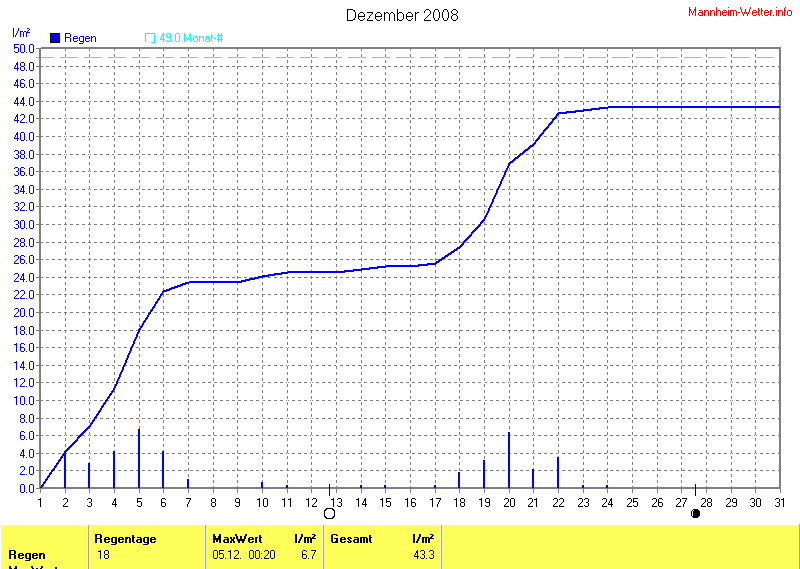 Dargestellt wird die grafische Übersicht für den Niederschlag. Zu sehen sind immer die täglichen Niederschlagsmengen (von 0-24 Uhr) und in der ansteigenden Linie die Summe aller Niederschläge: