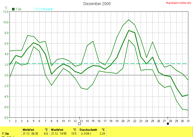 Die Durchschnittstemperatur für den Monat Dezember 2008 lag bei 2.24°C. Die Abweichung vom langjährigen Mittel war +0.04°C.