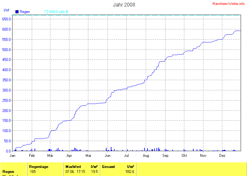 Die gesamte Regenmenge lag bei 592.6l/m² ( 88.6%) und war damit um -76.4l/m² vom langjährigen Wert entfernt. Niederschlag gab es an 165Tagen. Mehr als 2mm Regen gab es an 81Tagen. Sehr viel Regen mit mehr als 20mm pro Tag gab es an 0Tagen.