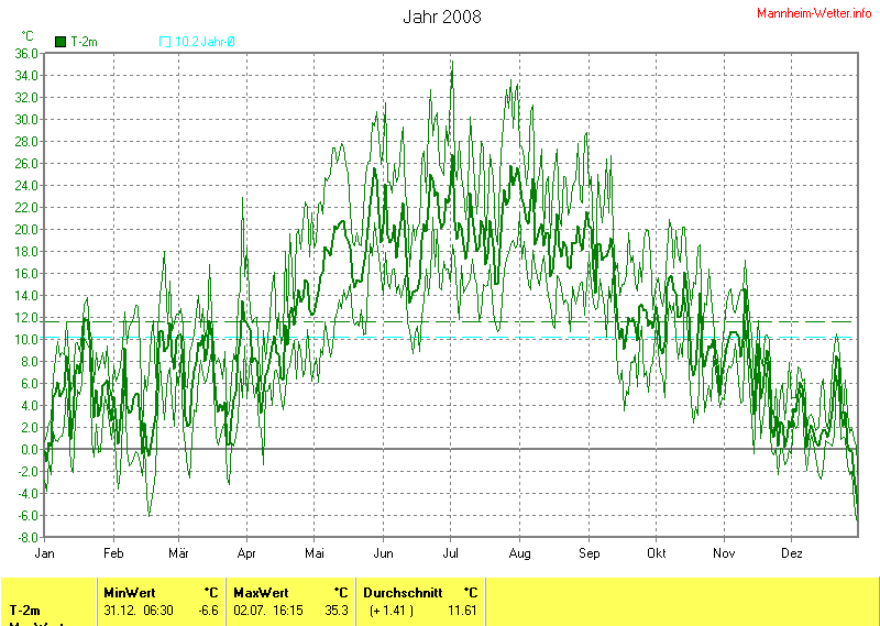 Die Durchschnittstemperatur für das Jahr 2008 lag bei 11.61°C. Die Abweichung vom langjährigen Mittel war +1.41°C.