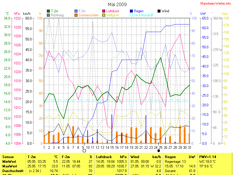 Der wärmste Tag war der 25.05.2009 um 17:15 mit 33.0°C. Am kältesten war es mit 5.5°C am 05.05.2009 um 03:25.