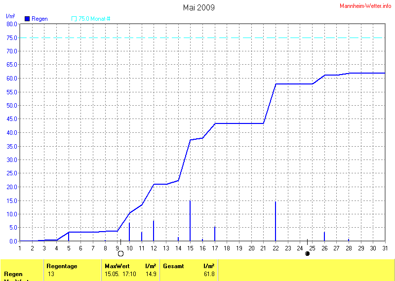 Dargestellt wird die grafische Übersicht für den Niederschlag. Zu sehen sind immer die täglichen Niederschlagsmengen (von 0-24 Uhr) und in der ansteigenden Linie die Summe aller Niederschläge: