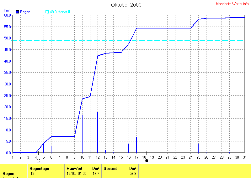Dargestellt wird die grafische Übersicht für den Niederschlag. Zu sehen sind immer die täglichen Niederschlagsmengen (von 0-24 Uhr) und in der ansteigenden Linie die Summe aller Niederschläge: