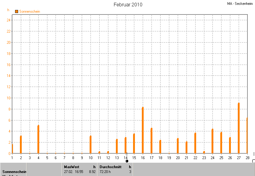 Der wärmste Tag war der 28.02.2010 um 12:30 mit 16.8°C. Am kältesten war es mit -5.3°C am 10.02.2010 um 23:40.