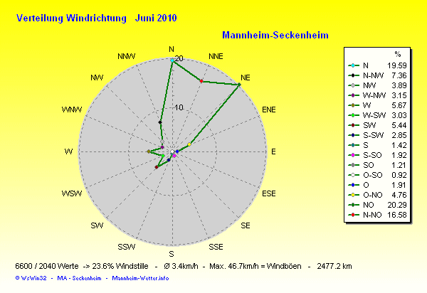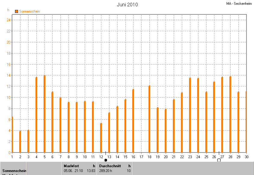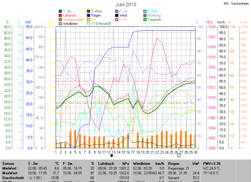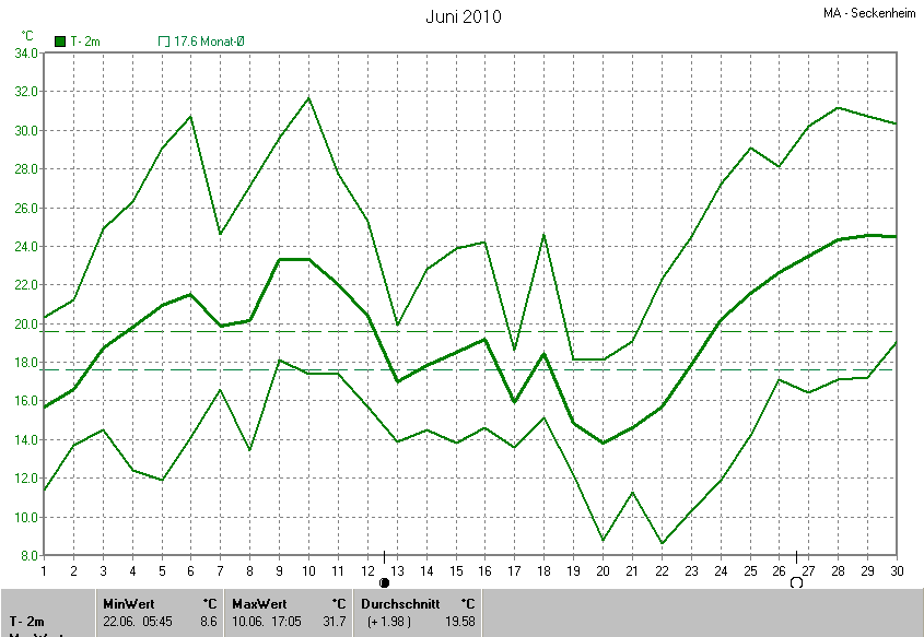 Der wärmste Tag war der 10.06.2010 um 17:05 mit 31.7°C. Am kältesten war es mit 8.6°C am 22.06.2010 um 05:45.