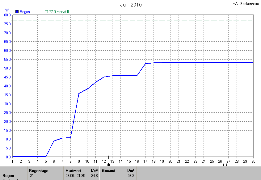 Die gesamte Regenmenge lag bei 53.2l/m² (entspricht: 69.1%) und war damit um -23.8l/m² vom langjährigen Wert entfernt. Niederschlag gab es an 12Tagen. Mehr als 2mm Regen gab es an 6Tagen. Sehr viel Regen mit mehr als 20mm pro Tag gab es an 1Tagen.