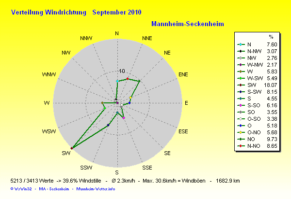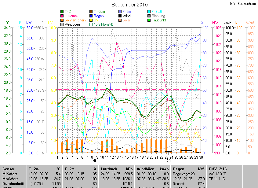 Die Durchschnittstemperatur für den Monat September 2010 lag bei 14.55°C. Die Abweichung vom langjährigen Mittel war -0.75°C.