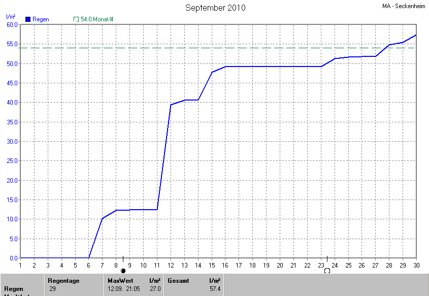 Der wärmste Tag war der 12.09.2010 um 15:35 mit 24.7°C. Am kältesten war es mit 5.4°C am 19.09.2010 um 07:20.