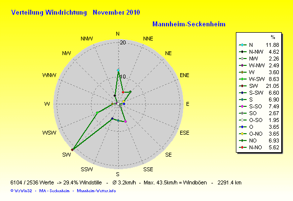 Der wärmste Tag war der 14.11.2010 um 13:50 mit 19.3°C. Am kältesten war es mit -3.9°C am 30.11.2010 um 08:25.