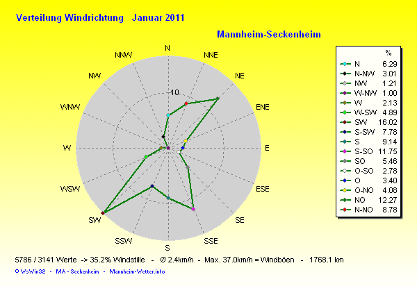 Die Durchschnittstemperatur für den Monat Januar 2011 lag bei 3.28°C. Die Abweichung vom langjährigen Mittel war +2.08°C.