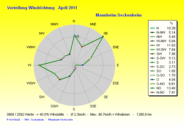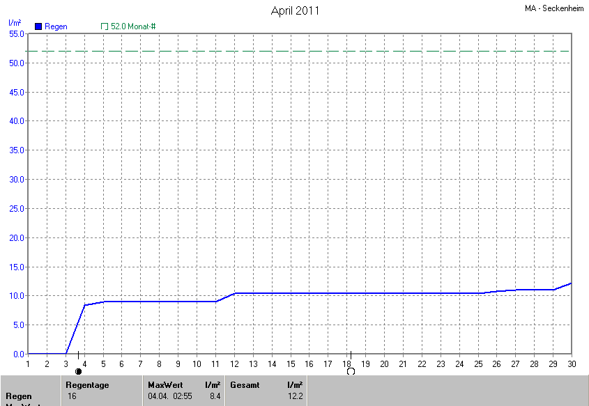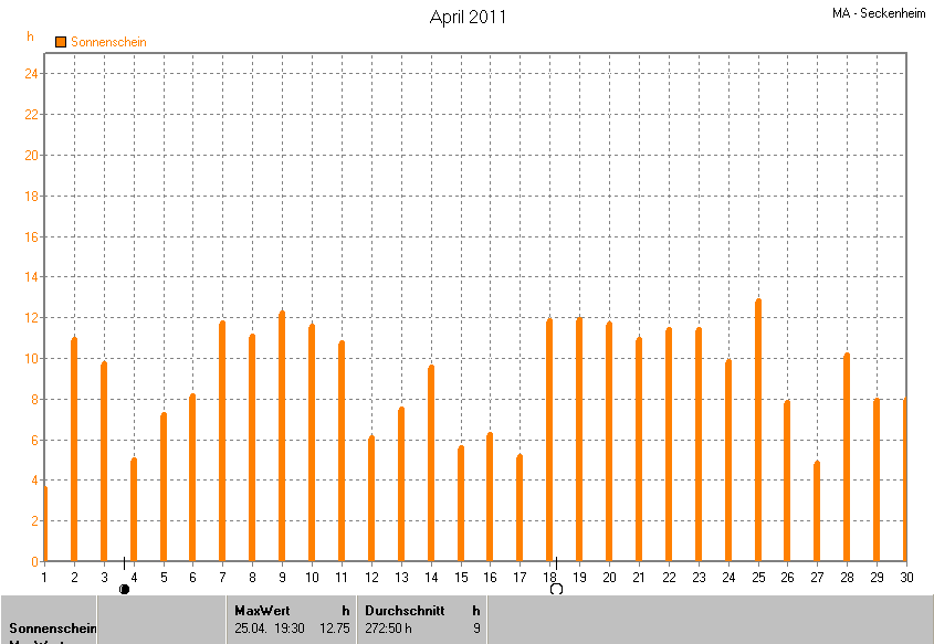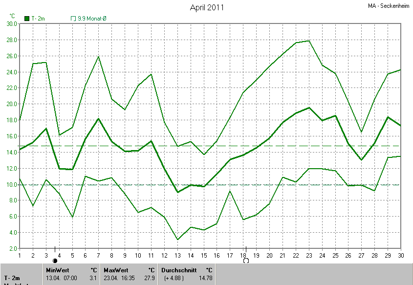Der wärmste Tag war der 23.04.2011 um 16:35 mit 27.9°C. Am kältesten war es mit 3.1°C am 13.04.2011 um 07:00.