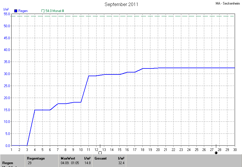 Der wärmste Tag war der 03.09.2011 um 15:35 mit 30.2°C. Am kältesten war es mit 8.7°C am 21.09.2011 um 07:20.