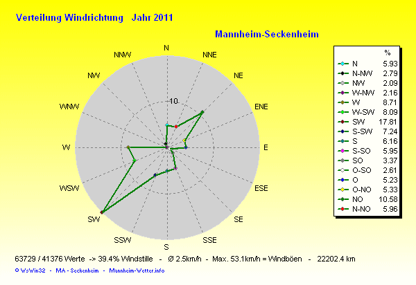 Die Durchschnittstemperatur für das Jahr 2011 lag bei 12.28°C. Die Abweichung vom langjährigen Mittel war +2.08°C.