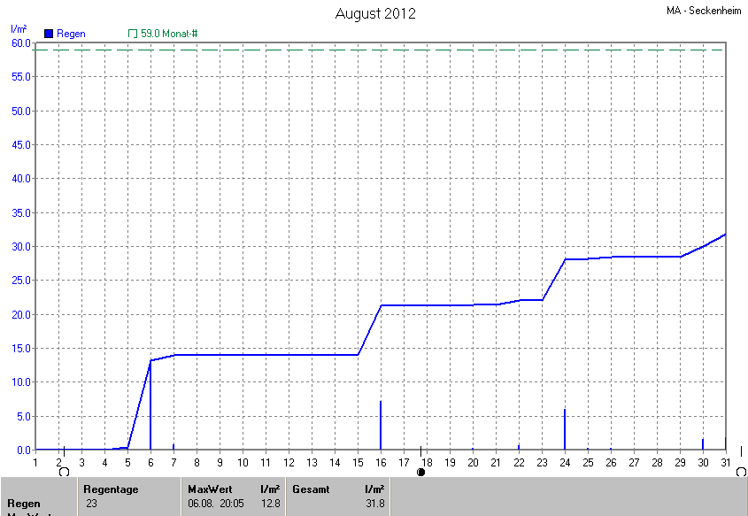 Der wärmste Tag war der 19.08.2012 um 17:05 mit 37.3°C. Am kältesten war es mit 12.0°C am 08.08.2012 um 06:20.