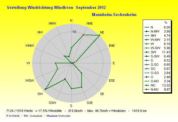 Die Durchschnittstemperatur für den Monat September 2012 lag bei 15.90°C. Die Abweichung vom langjährigen Mittel war +0.60°C.