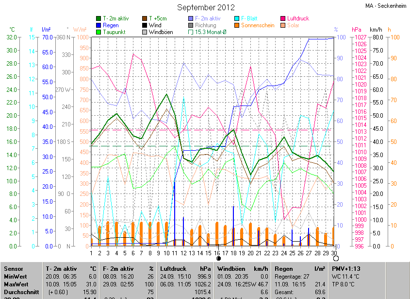 Der wärmste Tag war der 10.09.2012 um 15:05 mit 31.0°C. Am kältesten war es mit 6.0°C am 20.09.2012 um 06:35.