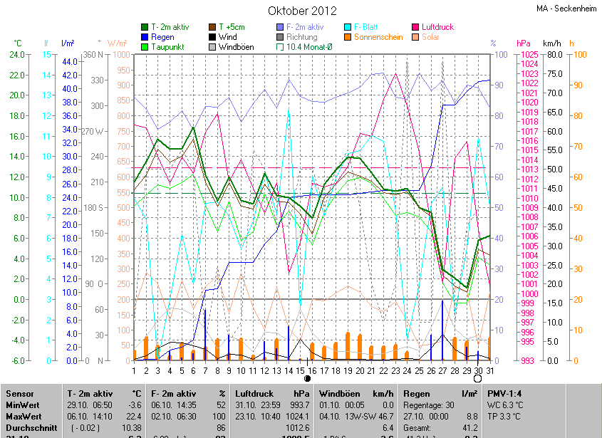 Die Durchschnittstemperatur für den Monat Oktober 2012 lag bei 10.38°C. Die Abweichung vom langjährigen Mittel war -0.02°C.