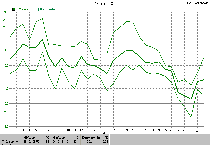 Der wärmste Tag war der 06.10.2012 um 14:10 mit 22.4°C. Am kältesten war es mit -3.6°C am 29.10.2012 um 06:50.