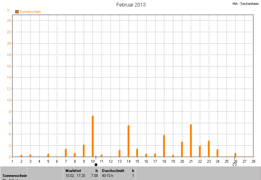 Dargestellt wird die grafische Übersicht für die Sonnenscheinzeit. Zu sehen sind immer die täglichen Sonnenstunden (von 0-24 Uhr):