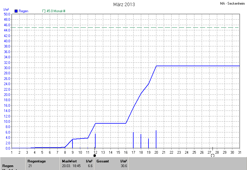 Die gesamte Regenmenge lag bei 30.6l/m² (entspricht: 68.0%) und war damit um -14.4l/m² vom langjährigen Wert entfernt. Niederschlag gab es an 10Tagen. Mehr als 2mm Regen gab es an 6Tagen. Sehr viel Regen mit mehr als 20mm pro Tag gab es an 0Tagen.