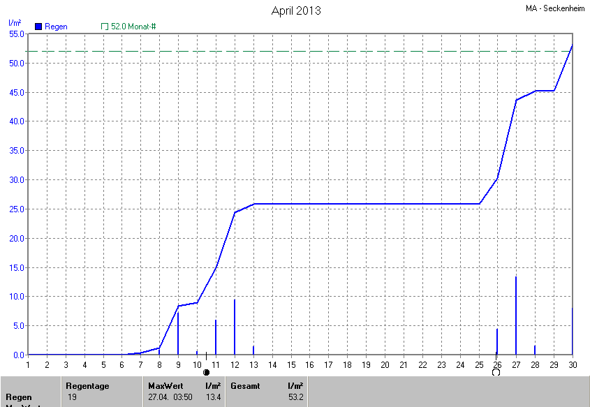 Die gesamte Regenmenge lag bei 53.2l/m² (entspricht: 102.3%) und war damit um +1.2l/m² vom langjährigen Wert entfernt. Niederschlag gab es an 11Tagen. Mehr als 2mm Regen gab es an 6Tagen. Sehr viel Regen mit mehr als 20mm pro Tag gab es an 0Tagen.