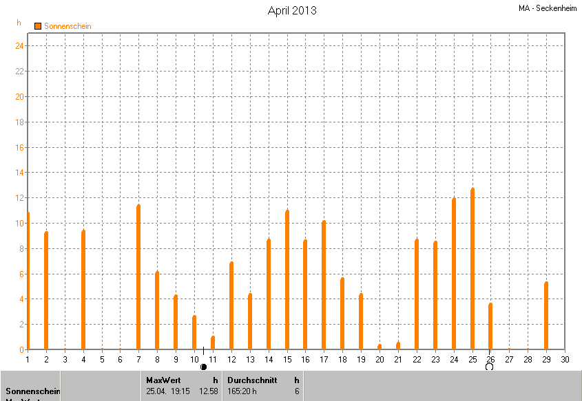 Die Durchschnittstemperatur für den Monat April 2013 lag bei 11.24°C. Die Abweichung vom langjährigen Mittel war +1.34°C.