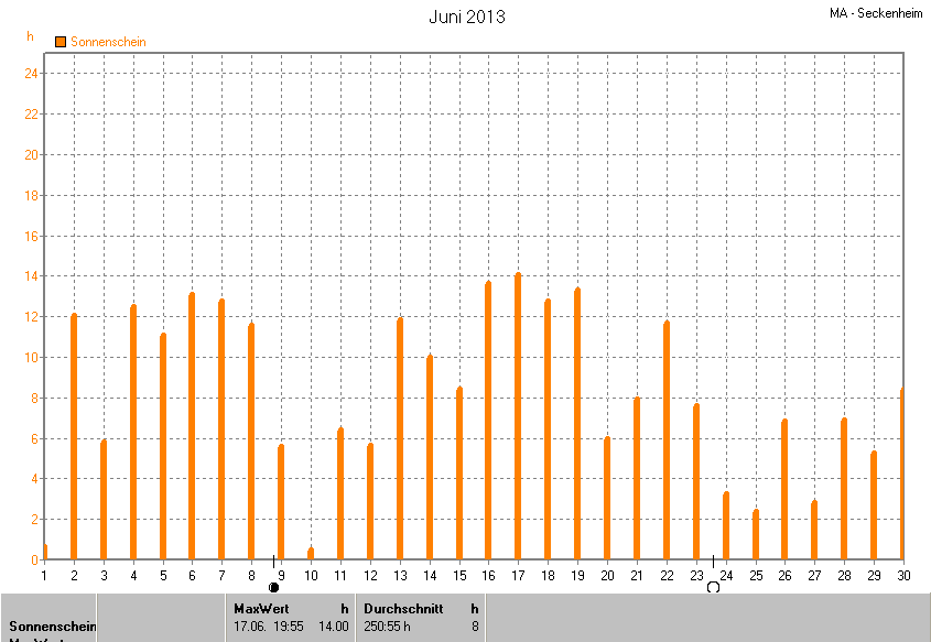 Dargestellt wird die grafische Übersicht für die Sonnenscheinzeit. Zu sehen sind immer die täglichen Sonnenstunden (von 0-24 Uhr):