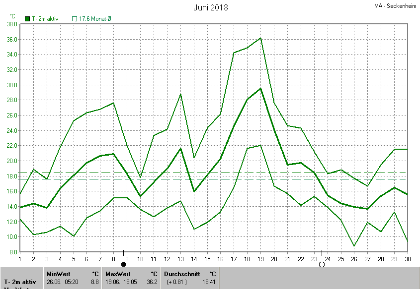 Der wärmste Tag war der 19.06.2013 um 16:05 mit 36.2°C. Am kältesten war es mit 8.8°C am 26.06.2013 um 05:20.