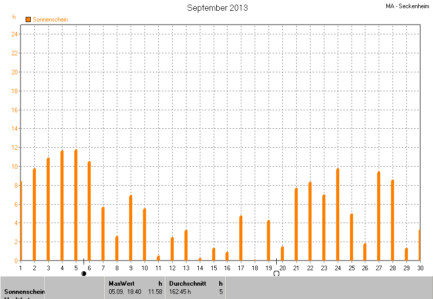 Dargestellt wird die grafische Übersicht für die Sonnenscheinzeit. Zu sehen sind immer die täglichen Sonnenstunden (von 0-24 Uhr):