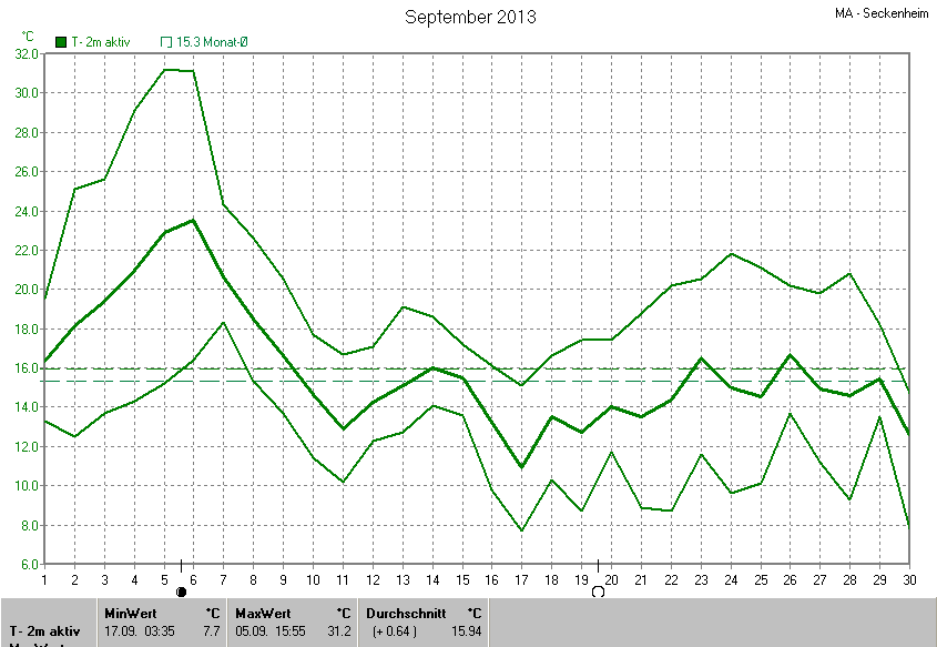 Die Durchschnittstemperatur für den Monat September 2013 lag bei 15.94°C. Die Abweichung vom langjährigen Mittel war +0.64°C.