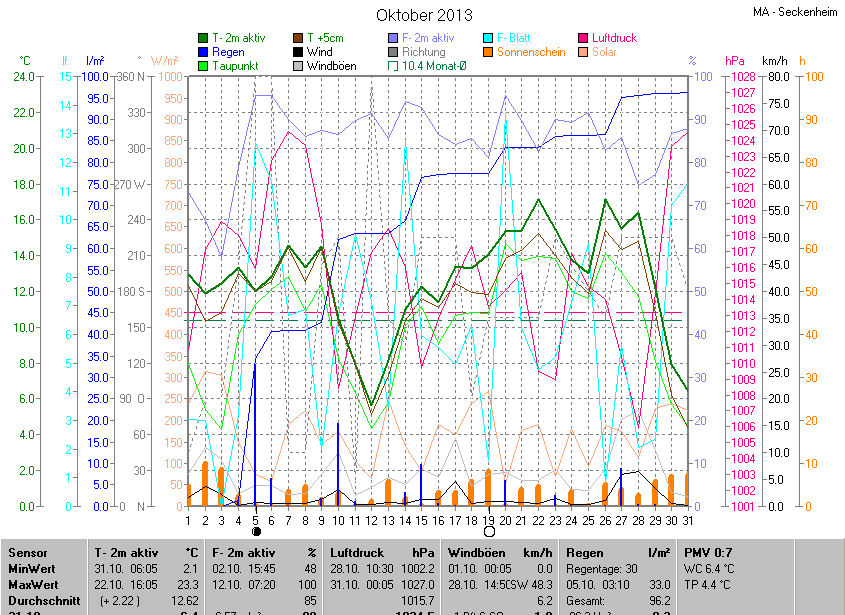 Die Durchschnittstemperatur für den Monat Oktober 2013 lag bei 12.62°C. Die Abweichung vom langjährigen Mittel war +2.22°C.