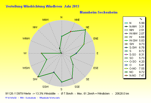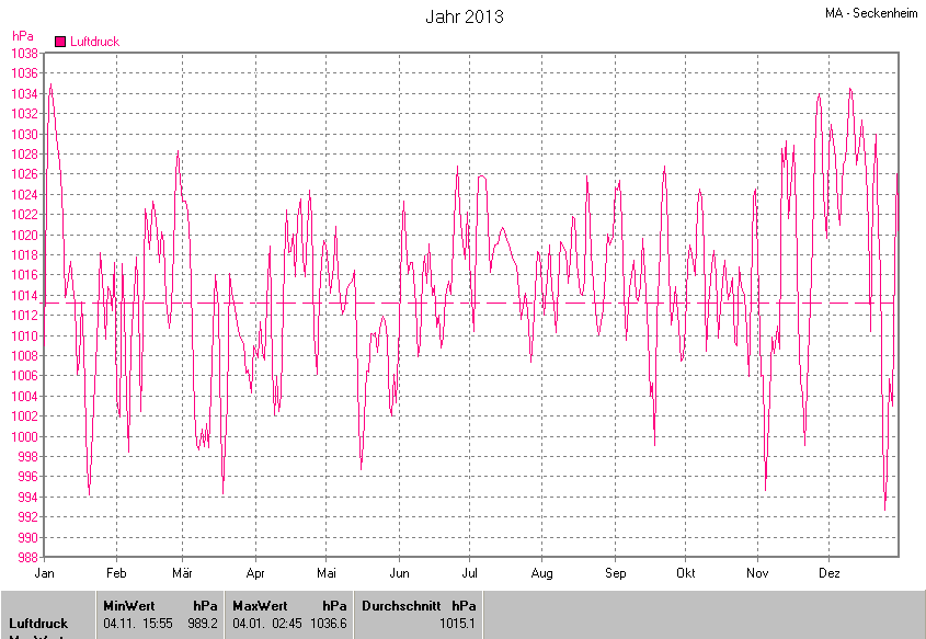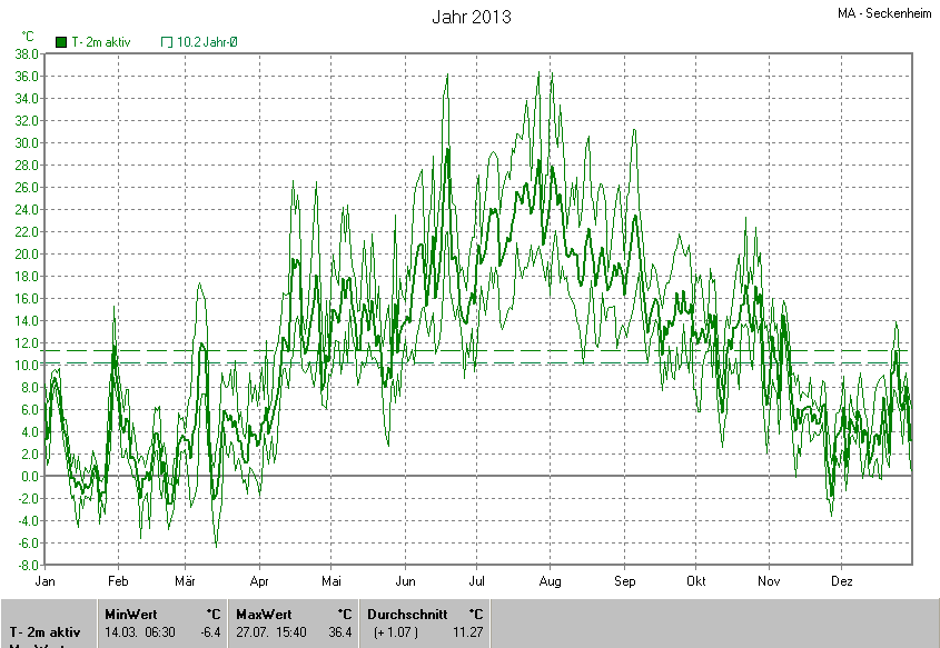 Die Durchschnittstemperatur für das Jahr 2013 lag bei 11.27°C. Die Abweichung vom langjährigen Mittel war +1.07°C.