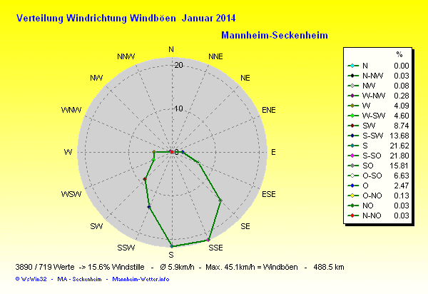 Die Durchschnittstemperatur für den Monat Januar 2014 lag bei 5.29°C. Die Abweichung vom langjährigen Mittel war +4.09°C.