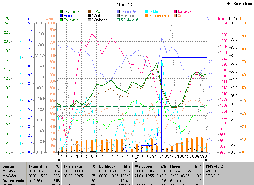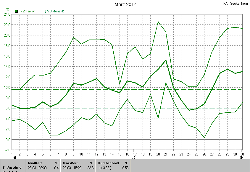 Die Durchschnittstemperatur für den Monat März 2014 lag bei 9.56°C. Die Abweichung vom langjährigen Mittel war +3.66°C.
