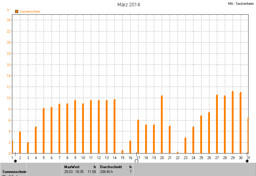 Dargestellt wird die grafische Übersicht für die Sonnenscheinzeit. Zu sehen sind immer die täglichen Sonnenstunden (von 0-24 Uhr):