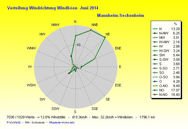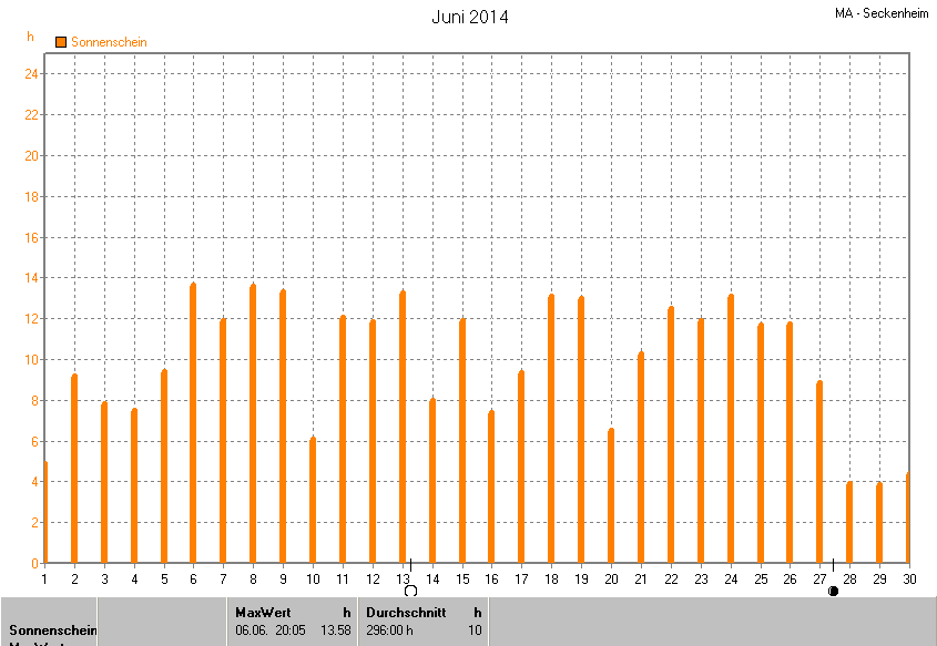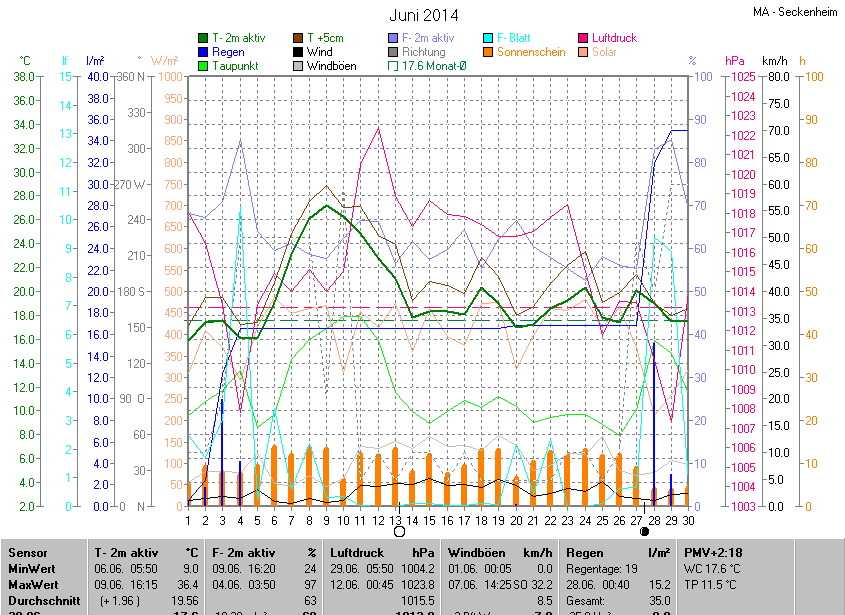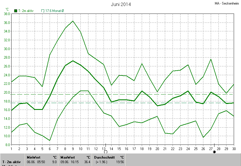 Der wärmste Tag war der 09.06.2014 um 16:15 mit 36.4°C. Am kältesten war es mit 9.0°C am 06.06.2014 um 05:50.