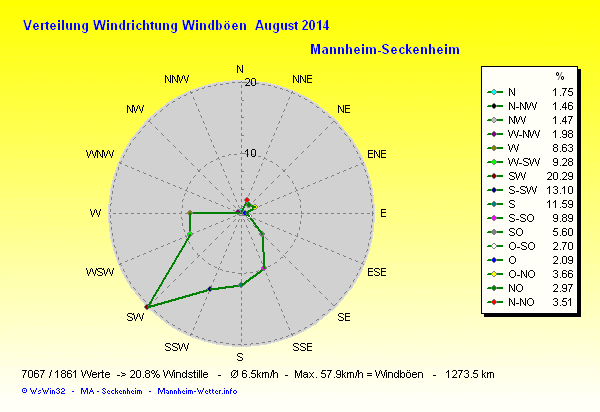 Die Durchschnittstemperatur für den Monat August 2014 lag bei 18.19°C. Die Abweichung vom langjährigen Mittel war -0.61°C.