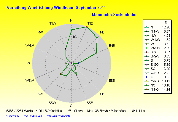 Der wärmste Tag war der 06.09.2014 um 16:10 mit 26.7°C. Am kältesten war es mit 6.4°C am 23.09.2014 um 06:05.