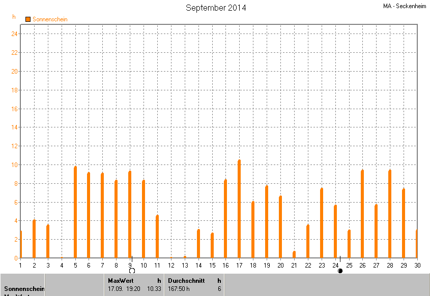 Dargestellt wird die grafische Übersicht für die Sonnenscheinzeit. Zu sehen sind immer die täglichen Sonnenstunden (von 0-24 Uhr):