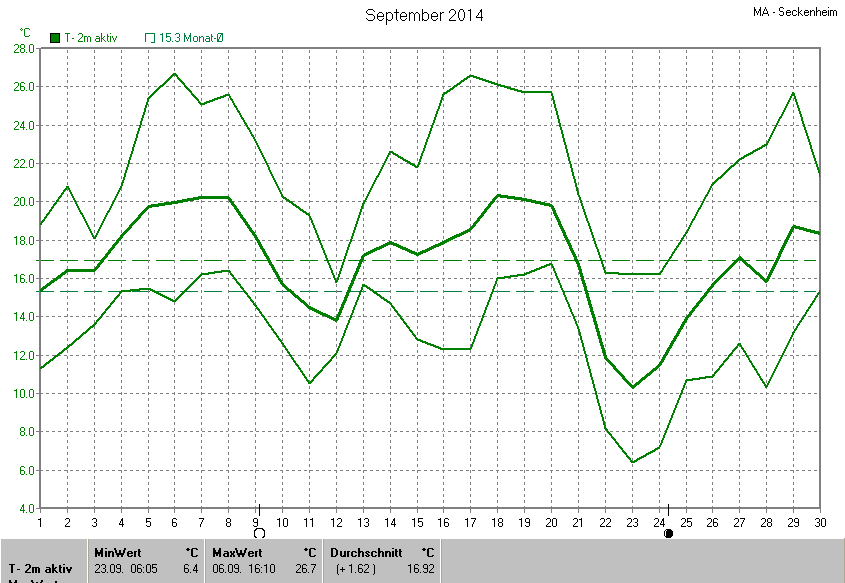 Die Durchschnittstemperatur für den Monat September 2014 lag bei 16.92°C. Die Abweichung vom langjährigen Mittel war +1.62°C.