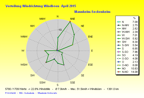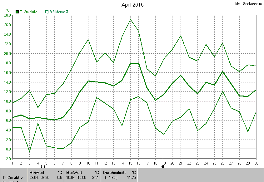 Die Durchschnittstemperatur für den Monat April 2015 lag bei 11.75°C. Die Abweichung vom langjährigen Mittel war +1.85°C.