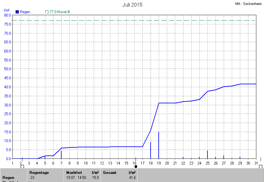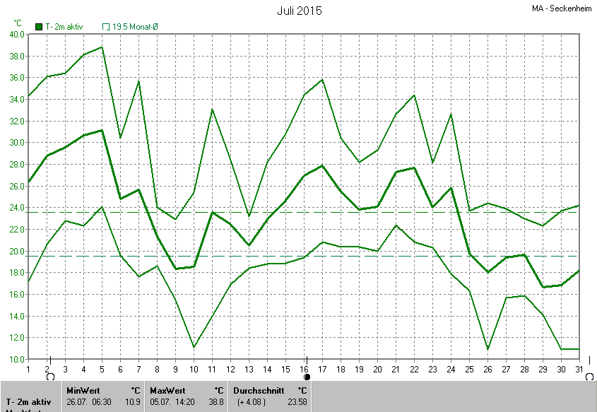 Die Durchschnittstemperatur für den Monat Juli 2015 lag bei 23.58°C. Die Abweichung vom langjährigen Mittel war +4.08°C.