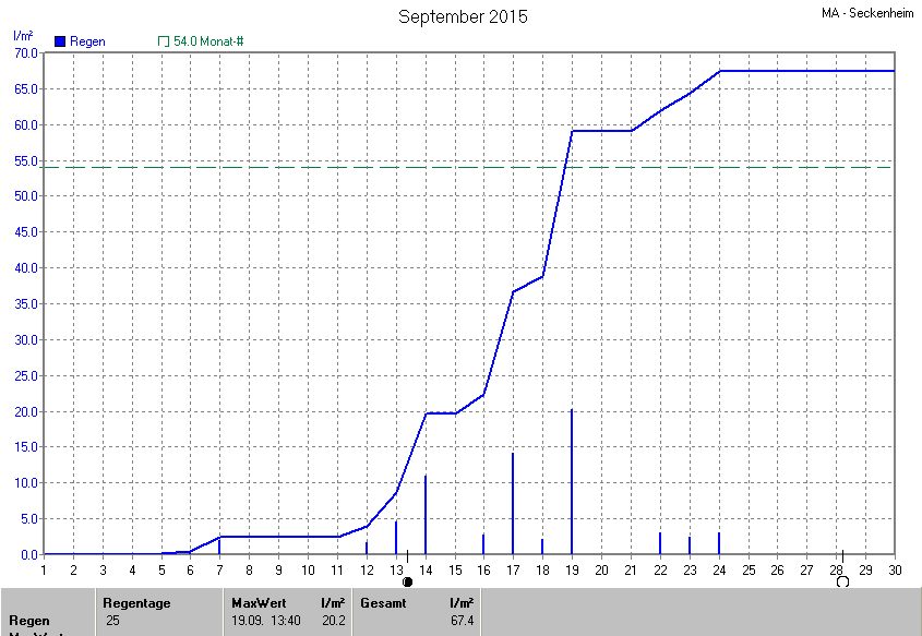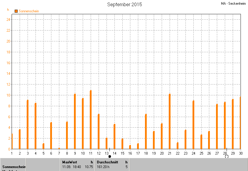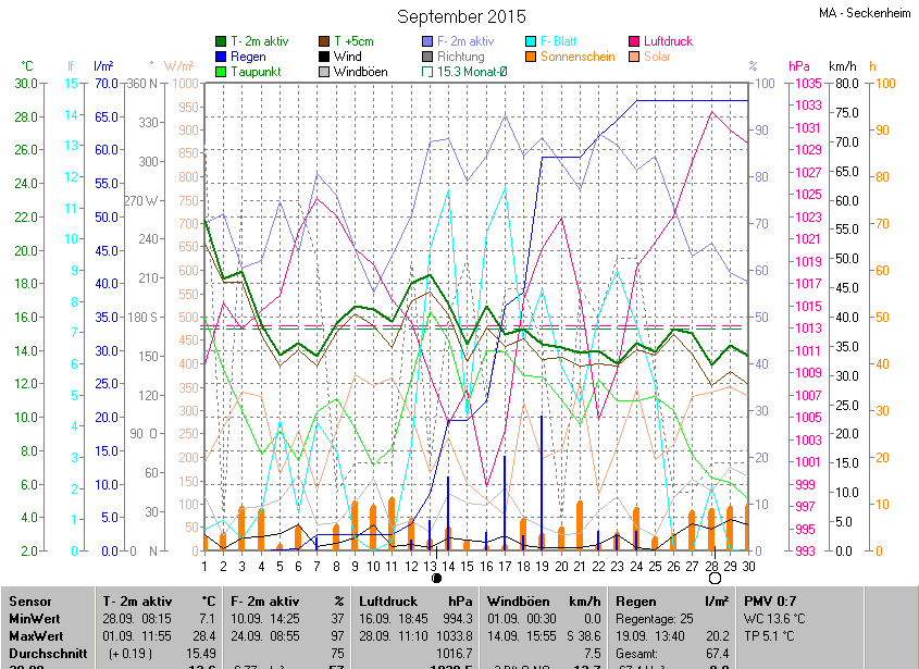 Der wärmste Tag war der 01.09.2015 um 11:55 mit 28.4°C. Am kältesten war es mit 7.1°C am 28.09.2015 um 08:15.
