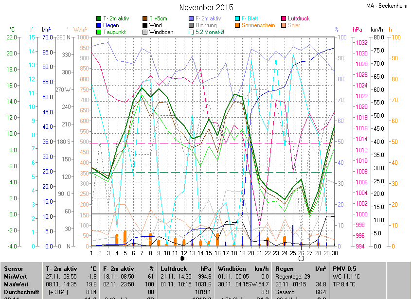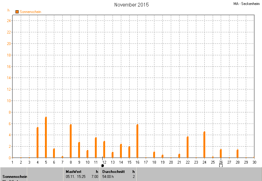 Der wärmste Tag war der 08.11.2015 um 14:35 mit 19.8°C. Am kältesten war es mit -1.8°C am 27.11.2015 um 06:55.