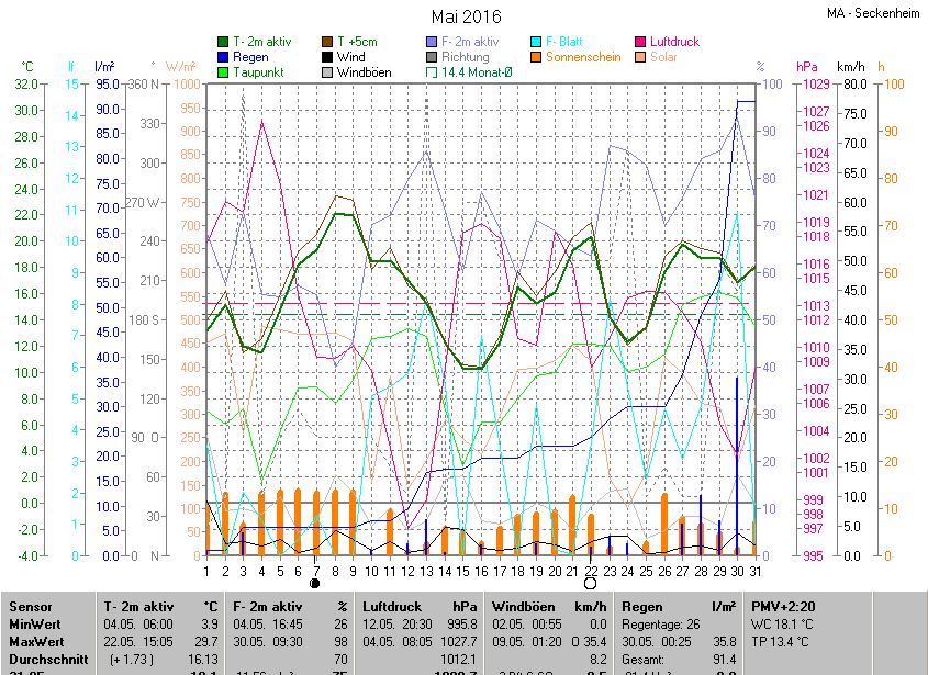 Der wärmste Tag war der 22.05.2016 um 15:05 mit 29.7°C. Am kältesten war es mit 3.9°C am 04.05.2016 um 06:00.