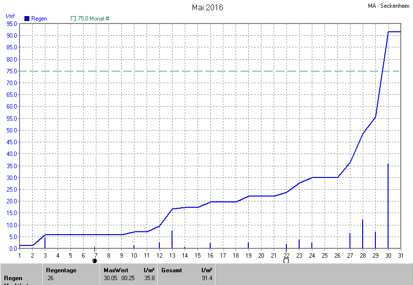 Die gesamte Regenmenge lag bei 91.4l/m² (entspricht: 121.9%) und war damit um +16.4l/m² vom langjährigen Wert entfernt. Niederschlag gab es an 15Tagen. Mehr als 2mm Regen gab es an 11Tagen. Sehr viel Regen mit mehr als 20mm pro Tag gab es an 1Tagen.