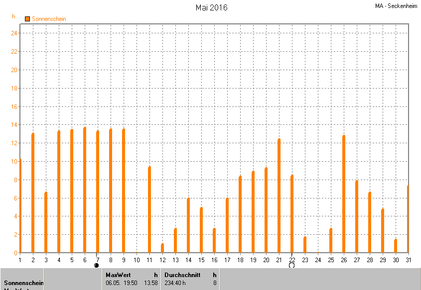 Dargestellt wird die grafische Übersicht für die Sonnenscheinzeit. Zu sehen sind immer die täglichen Sonnenstunden (von 0-24 Uhr):