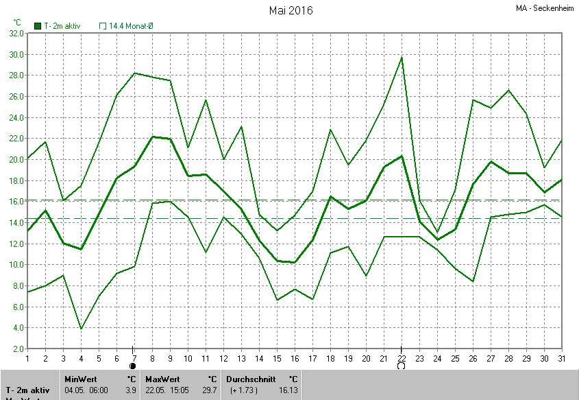 Die Durchschnittstemperatur für den Monat Mai 2016 lag bei 16.13°C. Die Abweichung vom langjährigen Mittel war +1.73°C.