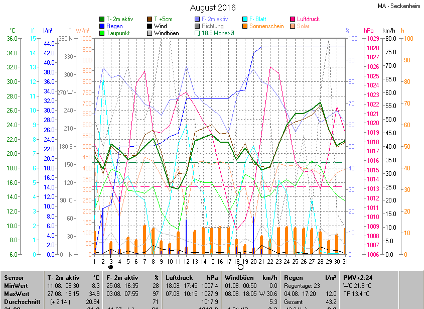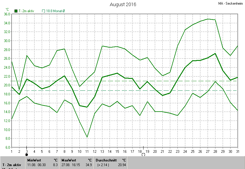 Der wärmste Tag war der 27.08.2016 um 16:15 mit 34.9°C. Am kältesten war es mit 8.3°C am 11.08.2016 um 06:30.